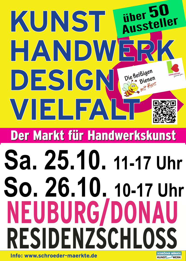 Am Samstag, 25. Oktober (11–17 Uhr) und Sonntag, 26. Oktober (10–17 Uhr) ist es wieder soweit: Das prachtvolle Residenzschloss Neuburg öffnet seine Tore für den beliebten Kunsthandwerkermarkt, der mit über 50 Ausstellern den Beginn der Herbstmarktsaison einläutet. In historischem Ambiente trifft hier Kunst, Handwerk und Design auf kreative Ideen und wertvolle Handwerkskunst. Die Besucher erwartet eine große Vielfalt an Dekorationen und Geschenkideen für die bevorstehende Advents- und Weihnachtszeit – von liebevoll gefertigten Einzelstücken bis zu hochwertigen Pro-dukten. Das Angebot reicht von einzigartigen Strickjacken, Mänteln, Ledergürteln und Leinenprodukten, Kinder- und Babykleidung, Papeterie- und Filzarbeiten, Schmuck in vielerlei Variationen, Edelstahlkunstwerken, Grußkarten, Dekorationen aus Holz- und Gießkeramik, Woll- und Dekokränzen bis zu Keramikreiben zum feinen Reiben von Knoblauch, Ingwer, Parmesan, Muskat, Nüssen und vielem mehr. Entdecken Sie für das tägliche Wellnessvergnügen handgemachte Seifen, Peelings, Body Cremes, Lipbalms, Massage-, Haar- und Bart-Öle. Ein besonderes Highlight sind Upcycling-Accessoires – Taschen, Gürtel oder Kleidungsstücke, die aus alten Ölbildern zerschnitten, mit Leder verbunden, und umgearbeitet wurden. Auch kulinarisch wird einiges geboten: Karamellbonbons in verschiedenen Geschmacksrichtungen, Gewürze und vegane Nuss- und Mandel-aufstriche laden zum Probieren und Mitnehmen ein. Für Hundebesitzer gibt im Schlossinnenhof Biothane-Leinen und eine fachkundige Ernährungsberatung.